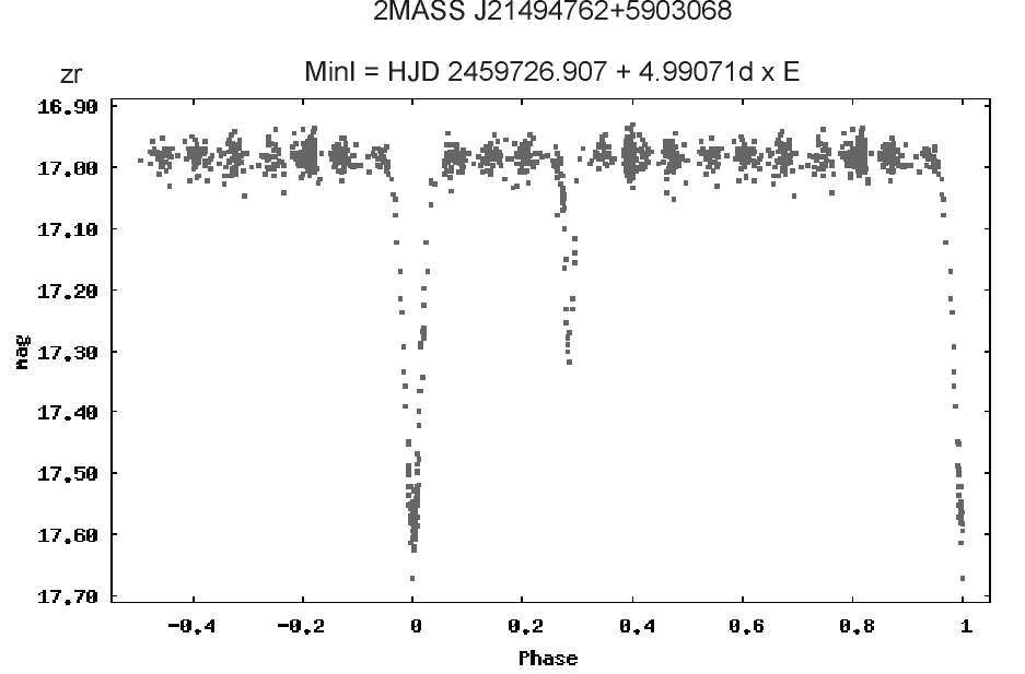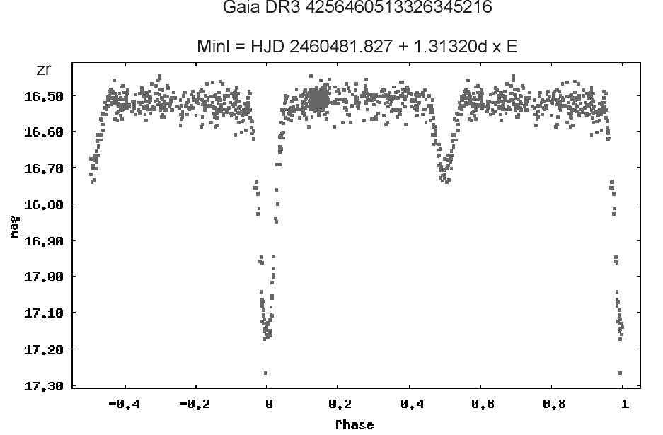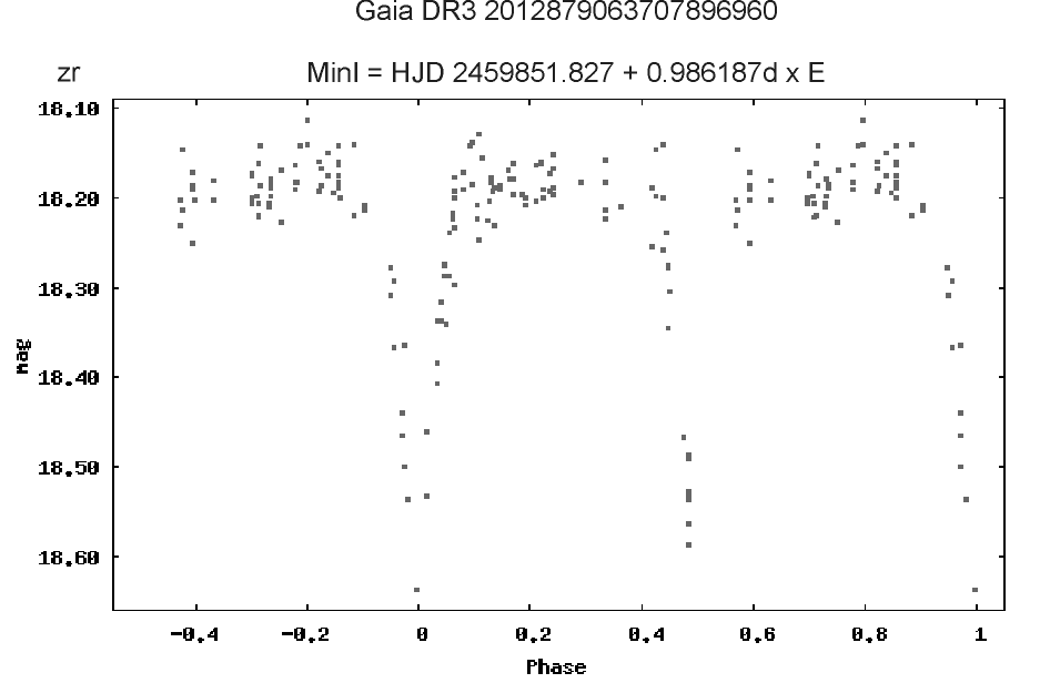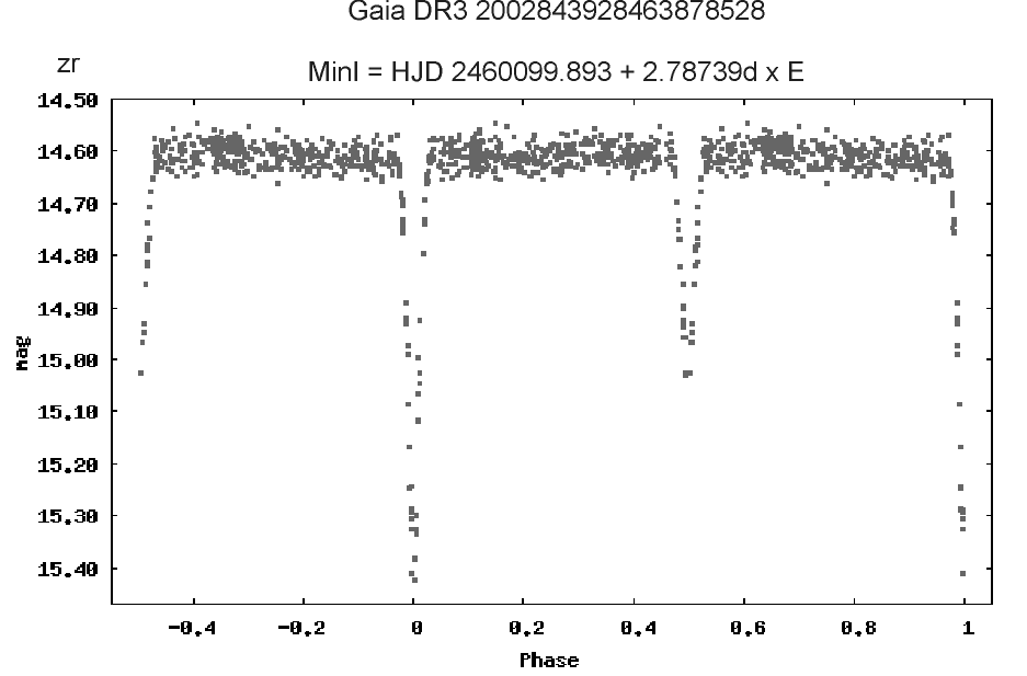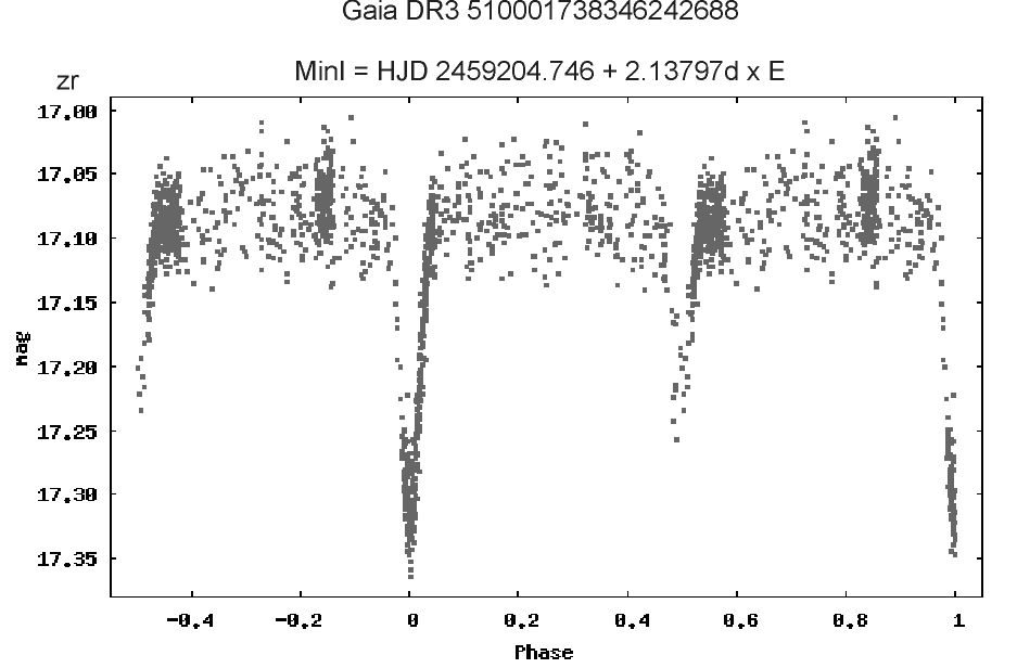 11. = USNO-A2.0 1425-12472259. MinII = 16.34 zr, D = 0.015 P. Eccentric orbit: MinII–MinI = 0.283 P. zg = 17.46 - 17.98, MinII = 17.96 zg. The object is included in the Gaia DR3 catalogue of variable stars (Gaia Collaboration, 2022) with the type E and erroneous P = 11.8937 d. Was also independently discovered by Khamrakulov et al. (2023) with uncertain type EA:, because only one minimum was observed.