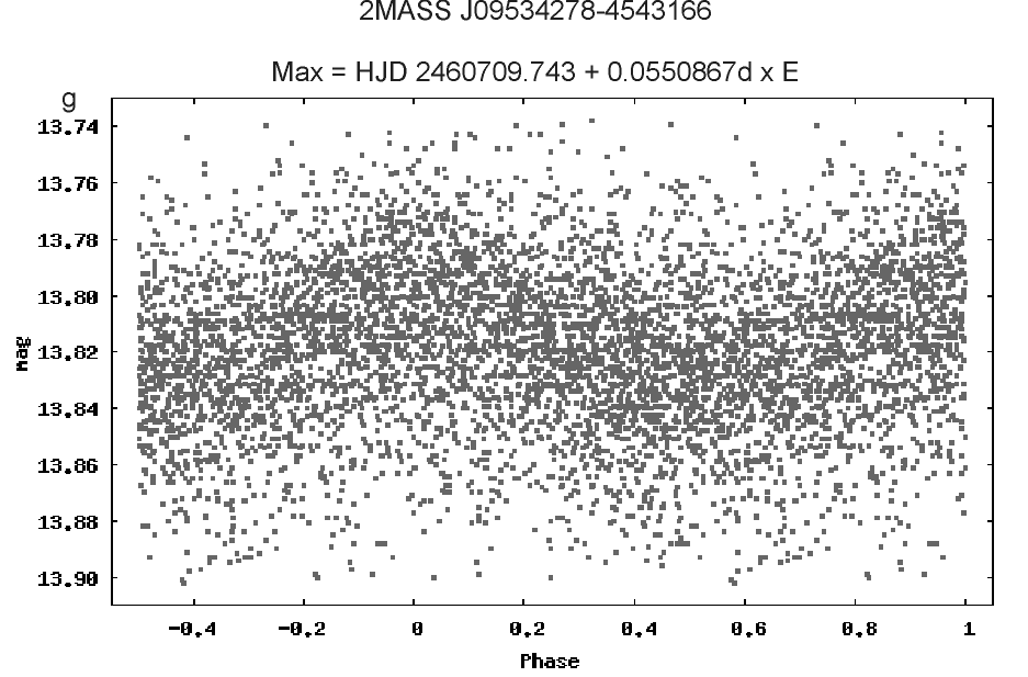 3. = GSC 08181-02326. M–m = 0.48 P. V = 13.64–13.68. Additional period P = 0.092813 d is clearly present at the power spectrum. This mode is probably nonradial. The variability was discovered by Csizmadia et al. (2016) as DSCT type with P ~ 0.1 d.