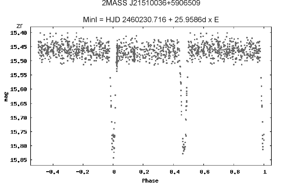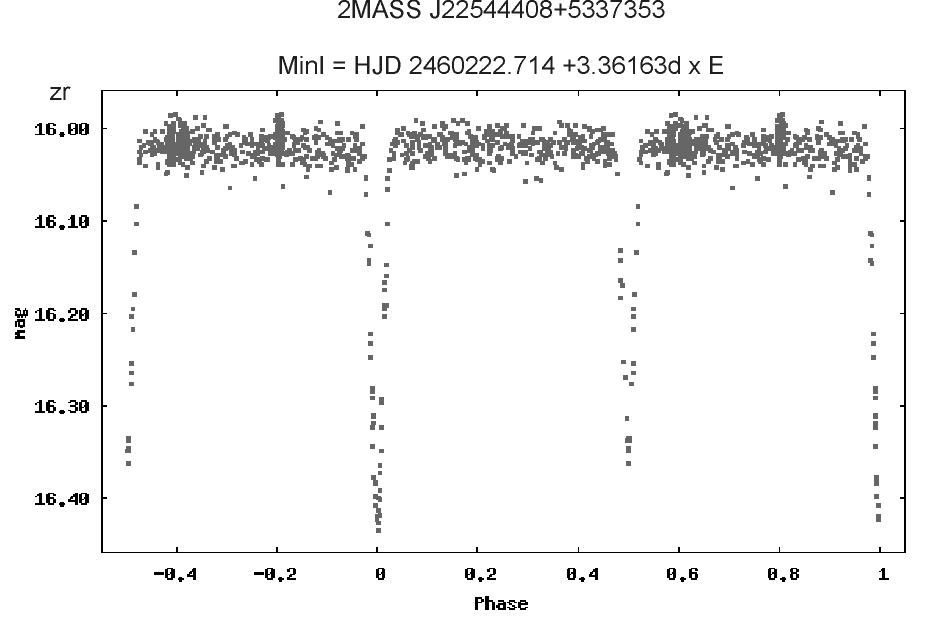 22. = USNO-A2.0 1500-10244847. MinII = 16.70 zr, D = 0.005 P. Eccentric orbit: MinII–MinI = 0.480 P. Combined photometry in ZTF r-band, ZTF g-band (near minimum) and R-band from Burkhonov et al. (2022) was used for period determination. Magnitudes in R-band were adjusted by +0.25 mag, in zg-band - by -0.79 mag. Variability was discovered by Burkhonov et al. (2022) with the type EA but only one minimum was detected.Remarks: